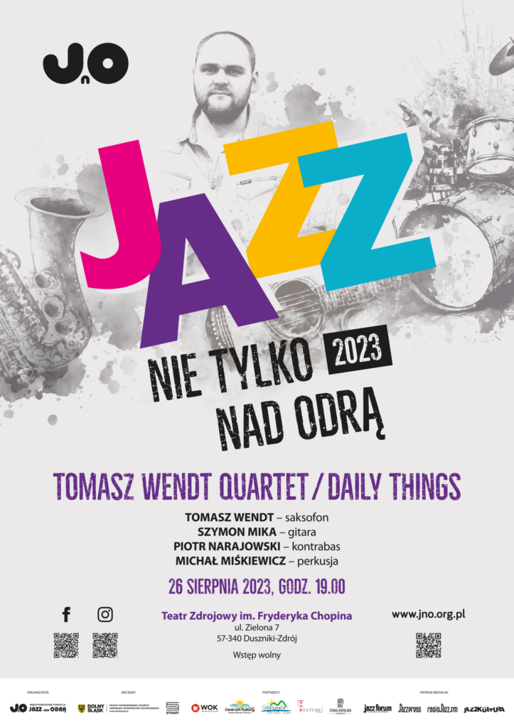 26 sierpnia br. o godz. 19.00 w Dusznikach-Zdrój wystąpi Tomasz Wendt Quartet. Jeden z najbardziej rozpoznawalnych saksofonistów młodszego pokolenia i laureat licznych nagród (w tym Fryderyka 2017 za jazzowy debiut roku), zaprezentuje materiał z wydanego w marcu albumu “Daily Things”. W Teatrze Zdrojowym im. F. Chopina zabrzmią utwory inspirowane dniami tygodnia, ilustrujące codzienne czynności, ulotne chwile i emocje w wykonaniu kwartetu w składzie: TOMASZ WENDT – saksofon