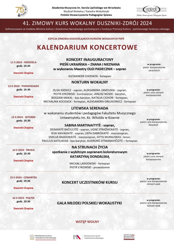 Od niedzieli 11 lutego do piątku 16 lutego zapraszamy na codzienne koncerty w ramach 41. Zimowego Kursu Wokalnego.