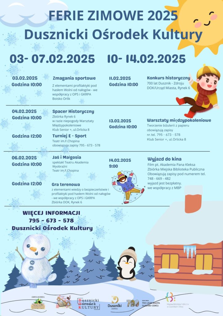 Z radością przedstawiamy wyjątkowy program, który sprawi, że te ferie będą pełne radości, przygód i twórczej energii. W sercu malowniczych Sudetów, oferujemy szereg atrakcji dla dzieci, młodzieży i całych rodzin.
